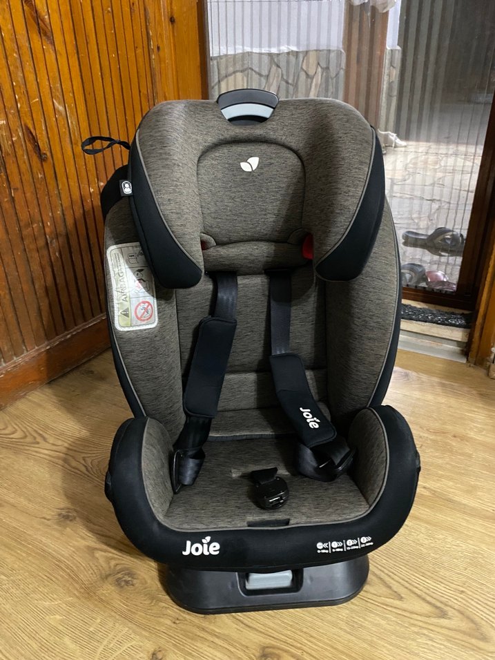 Joie markalı gri çocuk oto koltuğu, yastıklı başlık ve ayarlanabilir emniyet kemeri ile güvenli ve konforlu seyahat sağlar.