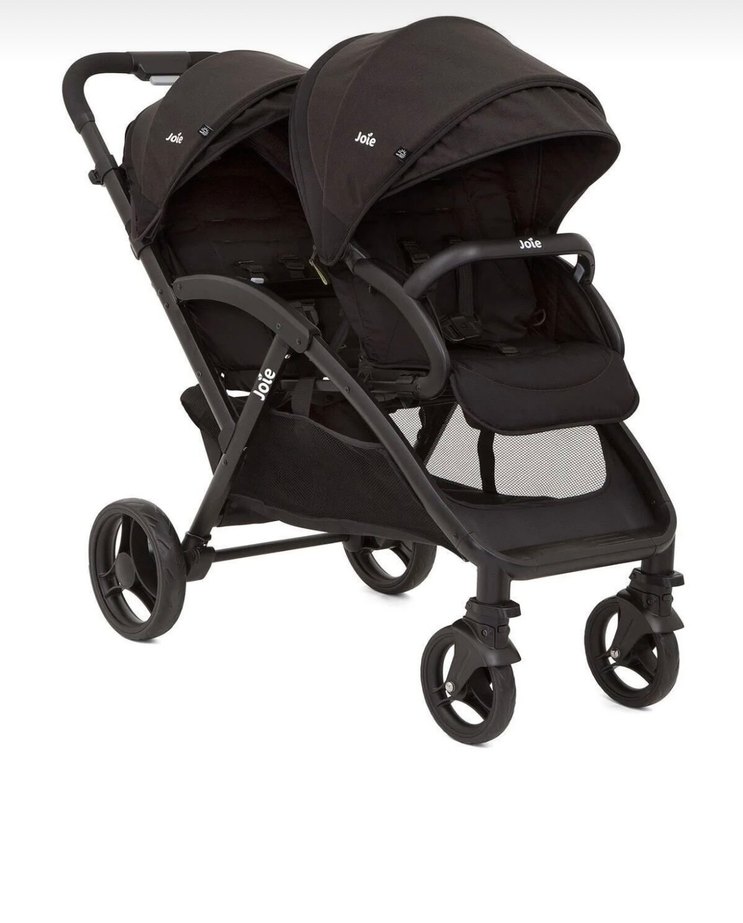Joie markasının siyah renkli ikiz bebek arabası, ayarlanabilir tente ve sağlam tekerlekleriyle rahat kullanım sağlar.