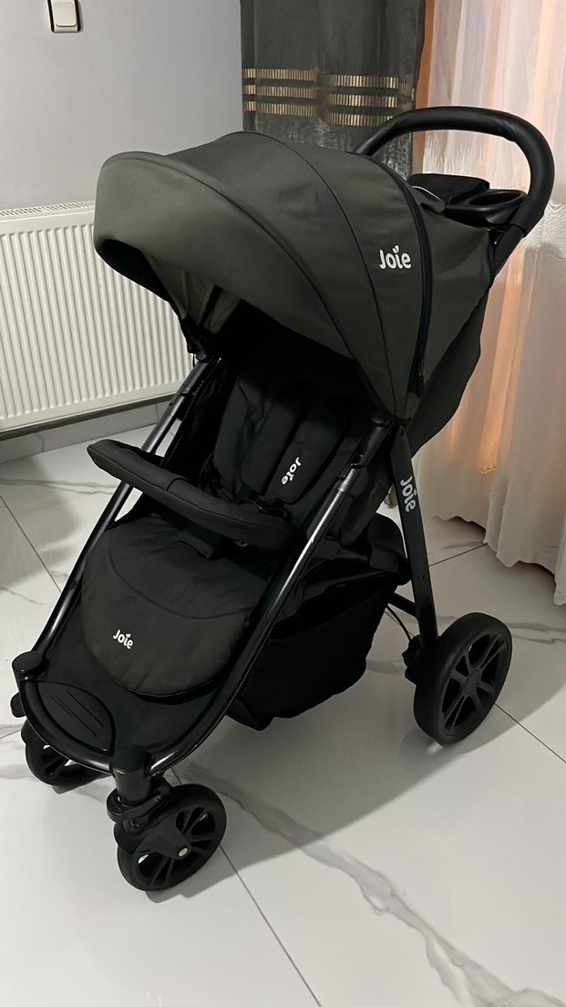 Joie marka siyah bebek arabası, sağlam iskelet, ayarlanabilir tente ve konforlu oturma alanı sağlar. Güvenlik barı ve kolay manevra yapan tekerlekleri vardır.