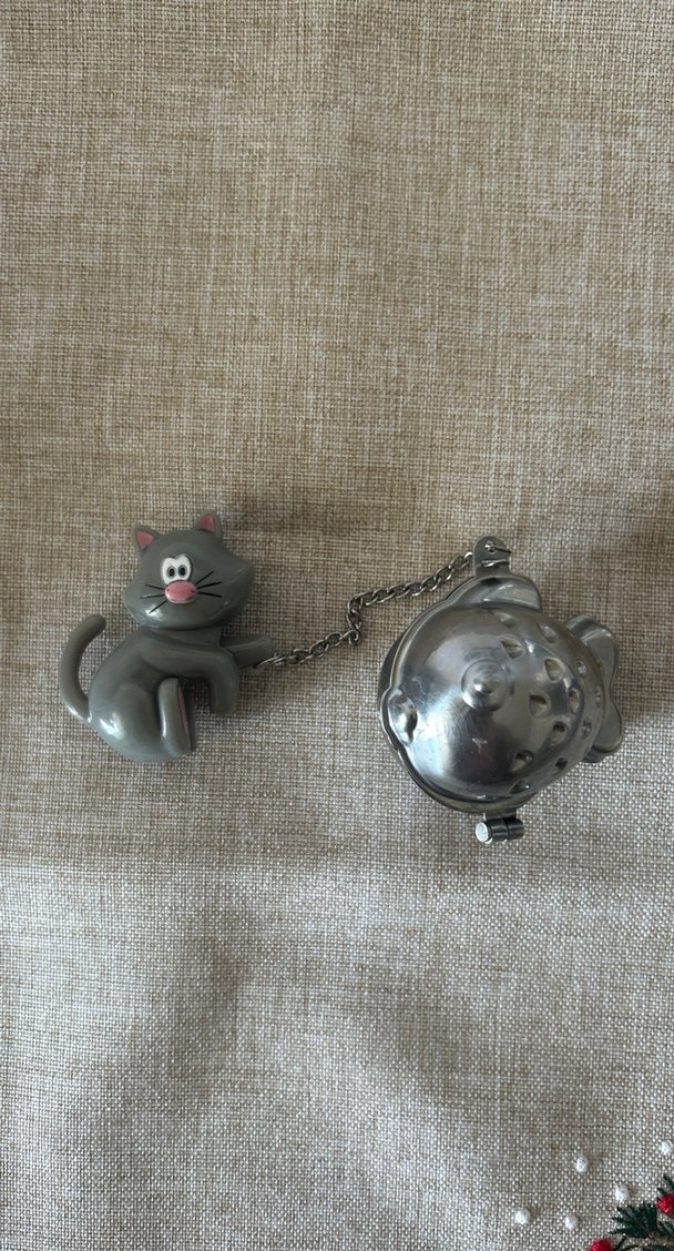 Oyuncu tasarımlı, metal balık şeklinde süzgeçi küçük zincirle kediye bağlı yuvarlak gri kedi figürlü çay demleme süzgeç.