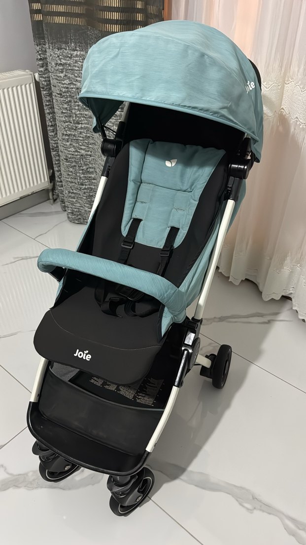 Joie bebek arabası pastel mavi oturma alanı ve tenteye sahip, siyah tabanlıdır. Güvenlik kemeri ve ön bar ile donatılmıştır. Hafif iskelet ve kolay hareket eden tekerlekler bulunur.