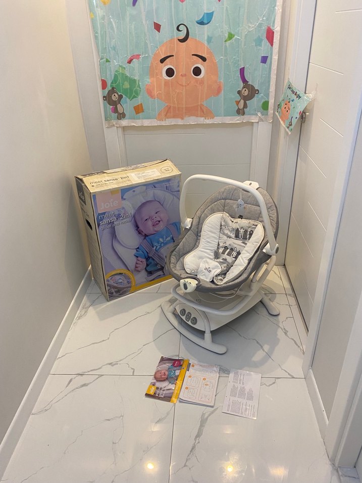 Yumuşak dolgulu oturma alanı ve güvenlik kemeri bulunan gri ve beyaz bebek salıncağı, rahatlatıcı hareketler için kontrol düğmeli sağlam çerçeveye sahiptir. ️
