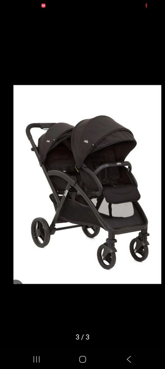 Joie siyah çiftli bebek arabası, ayarlanabilir tente ve emniyet kemerli iki koltukla konforlu sürüş sağlar.