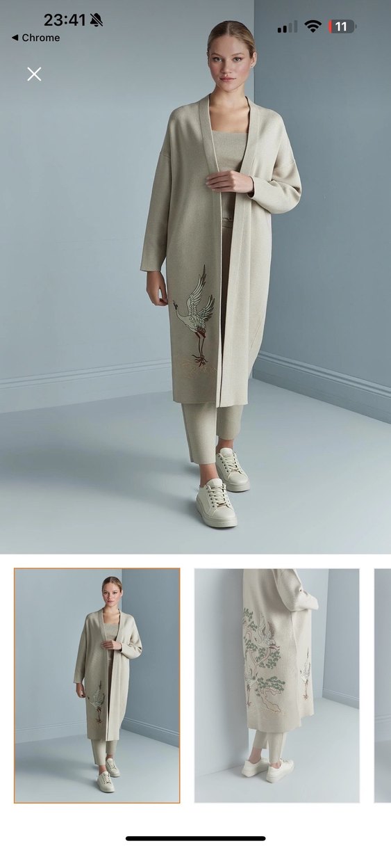 Bej renkte, nakışlı uzun kadın kaban. Yakası kesik ve kürk detaylıdır. Uzun kollu, sade ve günlük kullanıma uygun, rahat kesimdir.