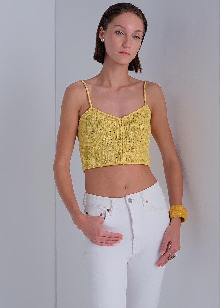 Join us ip askılı crop top. Uçuk sarı renginde crop, örme trikodur. Şuan satışta yeni sezon ürünüdür. S beden için uygundur. Etiket fiyatı 1200 tl.