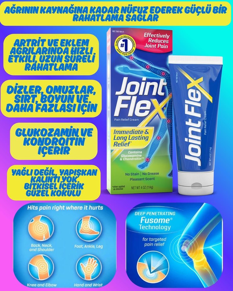 Joint Flex krem, artrit ve eklem ağrılarında hızlı ve uzun süreli rahatlama sağlar. Glukozamin ve kondroitin içerir, hoş bitkisel kokuludur. Diz, boyun, omuz, el ve ayak için uygundur.