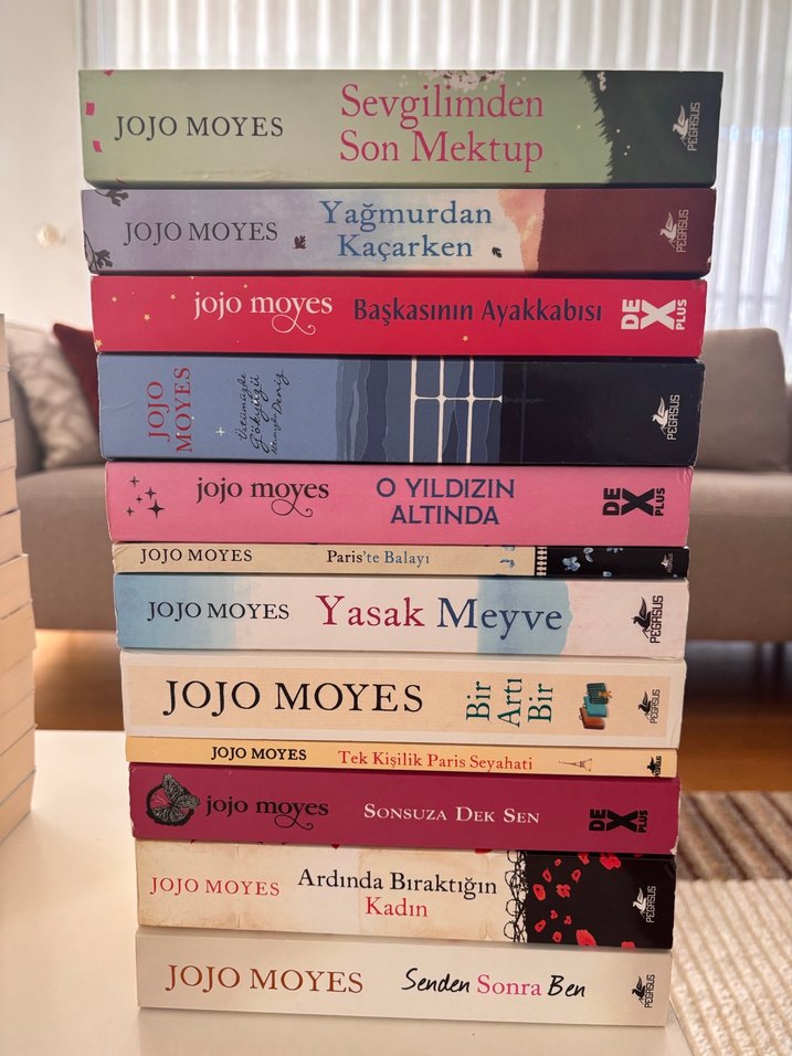 Jojo Moyes'un "Sevgilimden Son Mektup" ve "Yasak Meyve" gibi 12 romanından oluşan kitap seti. Adet fiyatları 150-250 tl arası değişmektedir.