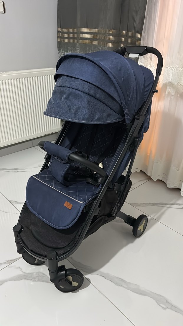Koyu mavi renkli bebek arabası, kapitone detaylı yastıklı oturma alanı, ayarlanabilir tente ve ön güvenlik barına sahiptir. Dört tekerlekli sağlam çerçeve ile kolay kullanılır.