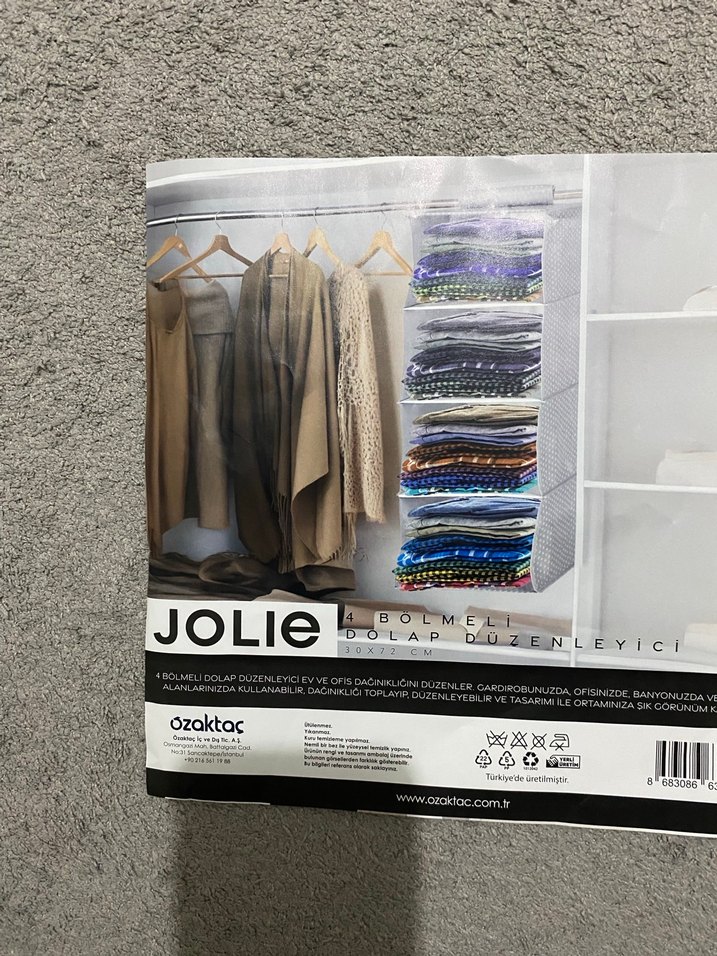 Jolie markasının 4 bölmeli gri dolap düzenleyicisi, kıyafetlerinizi düzenli şekilde katlayarak saklamanızı sağlar.