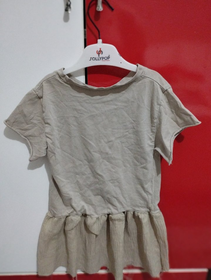 JOLLYPOP kız keten kısa kollu tişört, yuvarlak yakalı ve bol kesimdir. Bej ve gri tonlarda, etek kısmında fırfır detay bulunur.