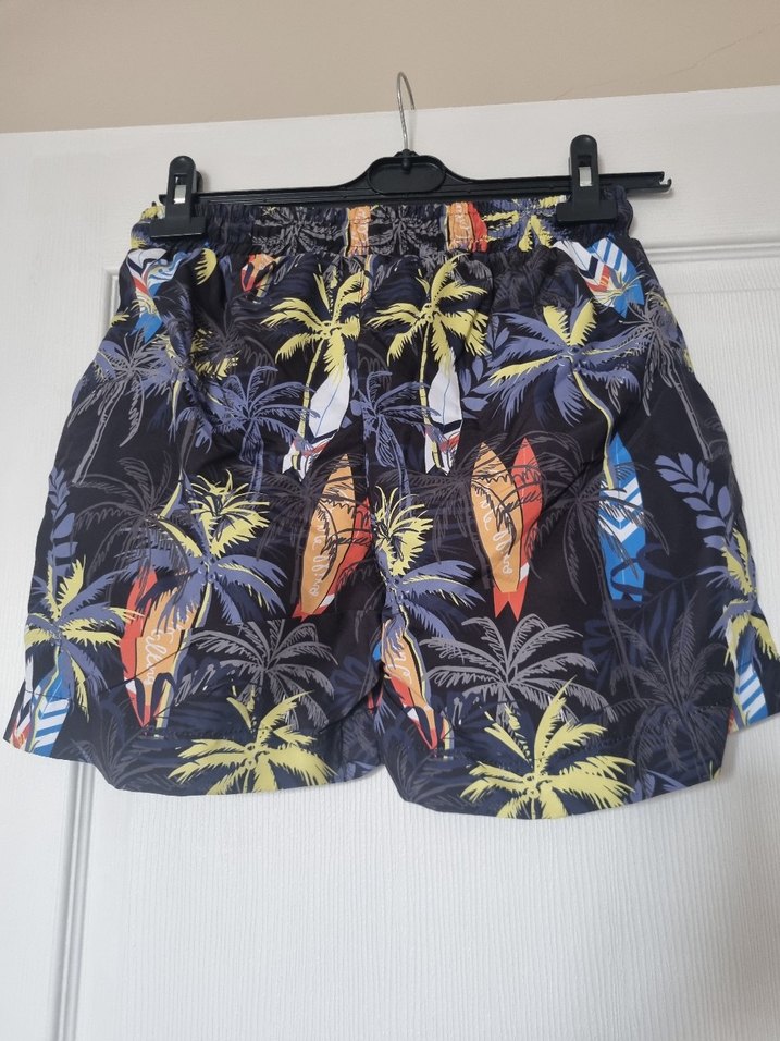 Rahat kesimli, kemerli ve canlı tropikal desenli erkek kısa mayo, plajda kullanıma uygun. Ürün sıfırdır