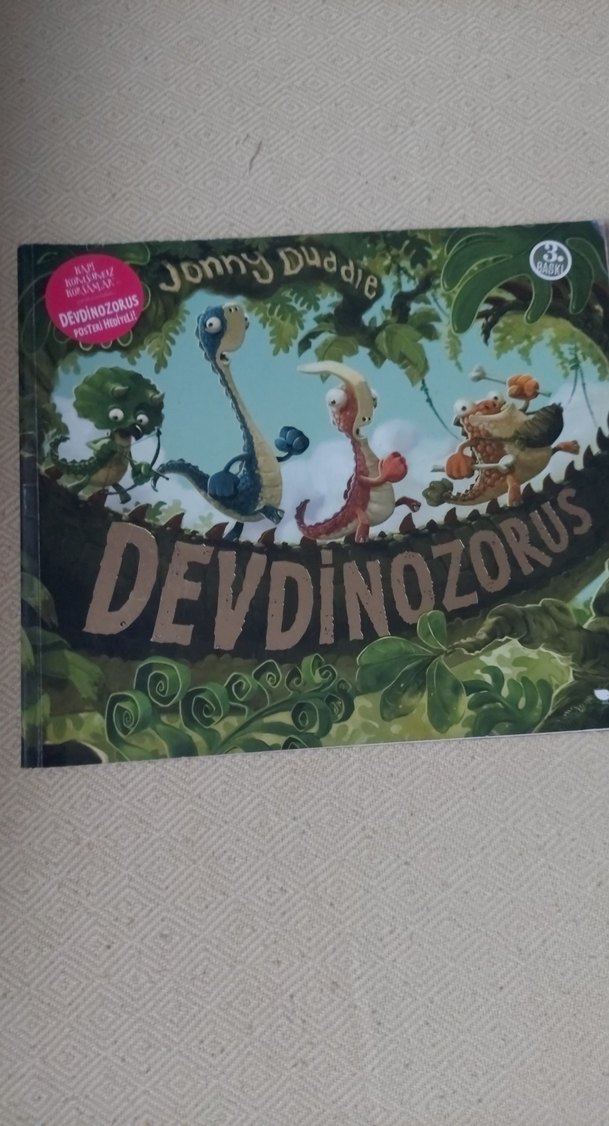 Jonny Duddle imzalı 'Devdinozorus' çocuk kitabı, renkli dinozor karakterleri içerir ve 3 yaş ve üzeri için uygundur. İçinde poster bulunmaktadır.
