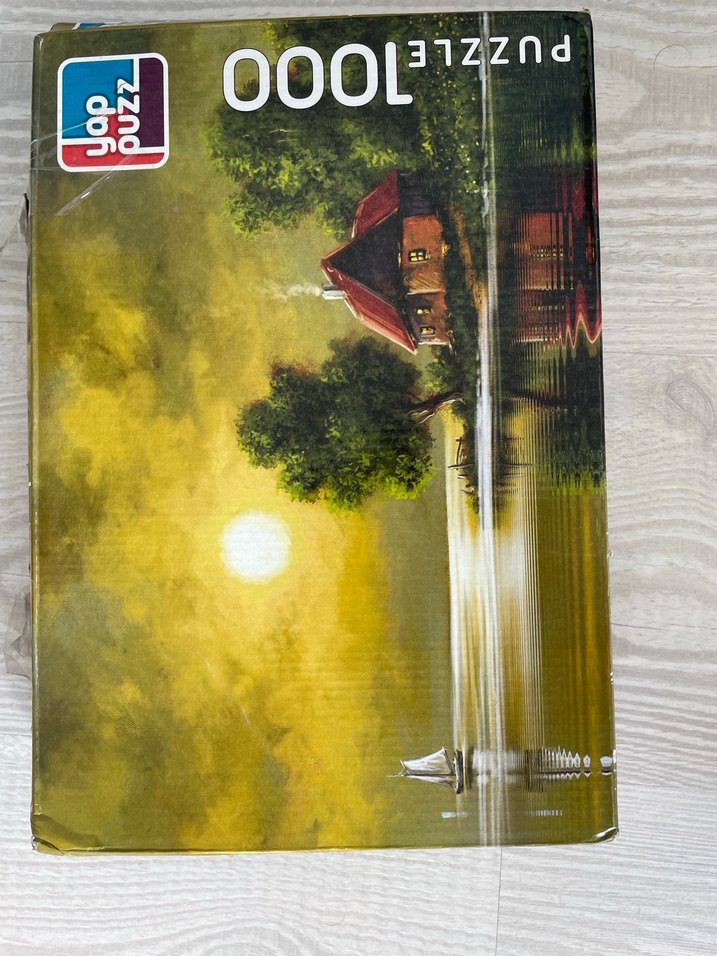 Jopuzz markasına ait, 1000 parçadan oluşan ve parlak yüzeye sahip, ev ve ağaçların bulunduğu sakin göl manzaralı puzzle.