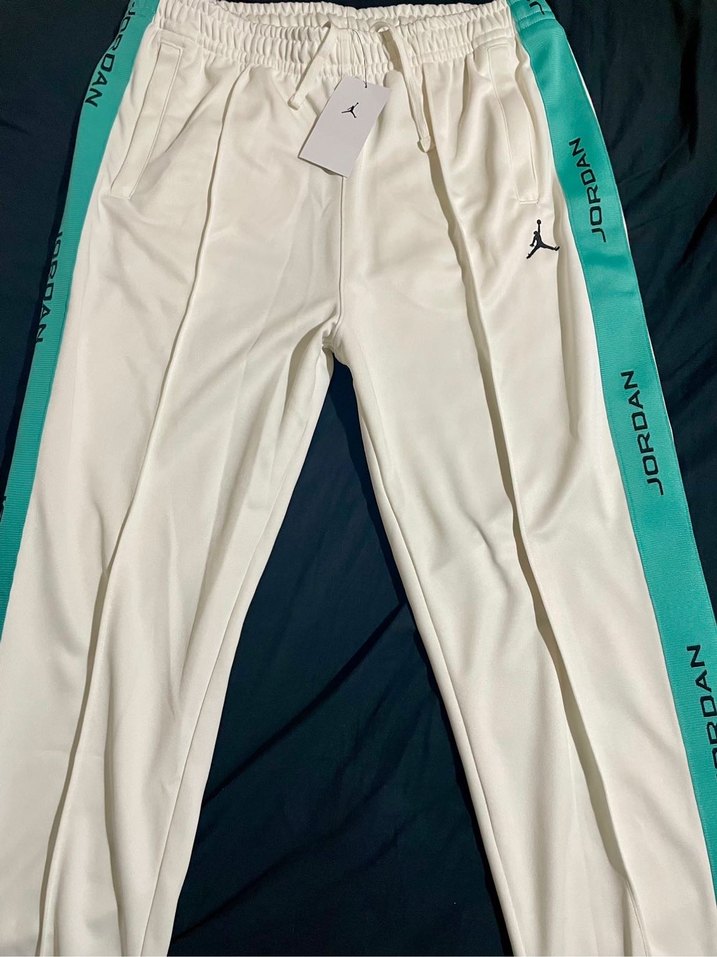 Jordan beyaz erkek eşofman altı, regular fit ve midi boy. Yumuşak sentetik kumaştan, yanlarda açık yeşil şerit ve Jordan logosu ile sportif tarz sunar.