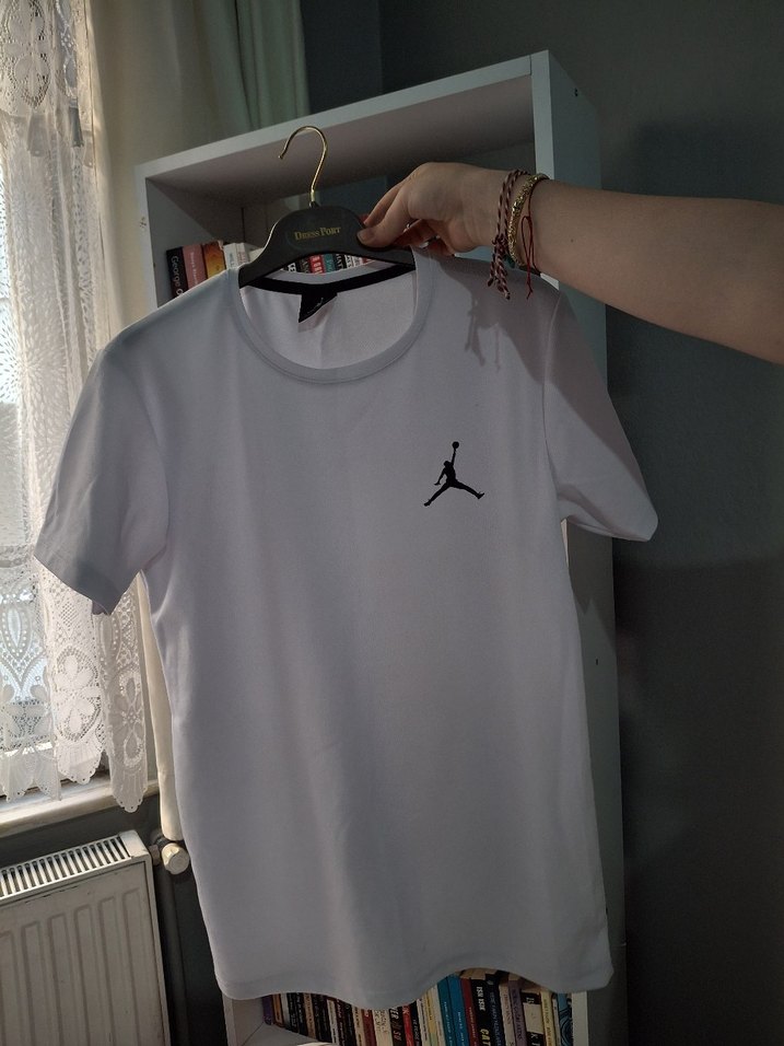Pamuklu, beyaz, kısa kollu, bisiklet yaka, dar kesim erkek tişört. Parlak baskılı Jordan logosu ile sporda veya günlük dısarda giyilebilir