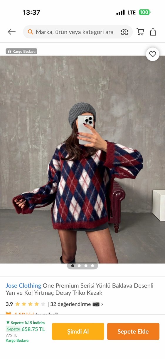 Bordo ve koyu tonlarda baklava desenli, yünlü triko, bol kesim, uzun kollu ve boğazlı. Yan ve kol yırtmaç detaylı, günlük kullanıma uygun rahat model.