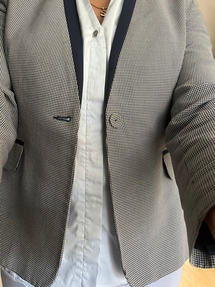 Ekose desenli mavi lacivert yakasız tek düğmeli midi boy vücuda oturan iş için uygun şık ceket