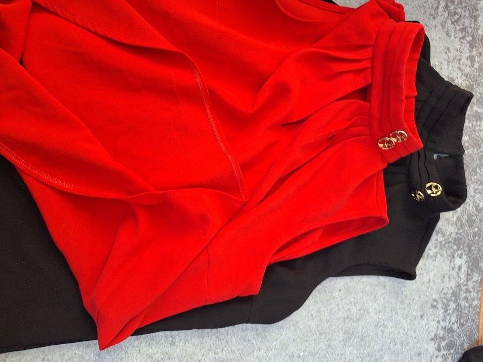 Yumuşak sentetik kumaştan, canlı kırmızı renkte, drapeli ve uzun kesime sahip dar kesim hamile eteği. Spor ve sokak tarzı için uygundur
