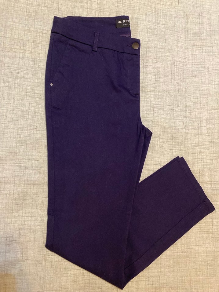 Journey marka, laciverte çalan koyu mor tonunda, pamuk/polyester karışımı likralı kanvas pantolon. Kısmen düşük belli sayılabilir, dar paça model. 40 beden, ölçüleri fotolarda mevcuttur.