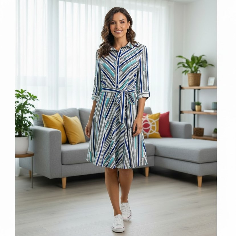 Çok renkli, V yaka, uzun kollu ve kuşaklı midi boy günlük elbise hiç giyilmedi