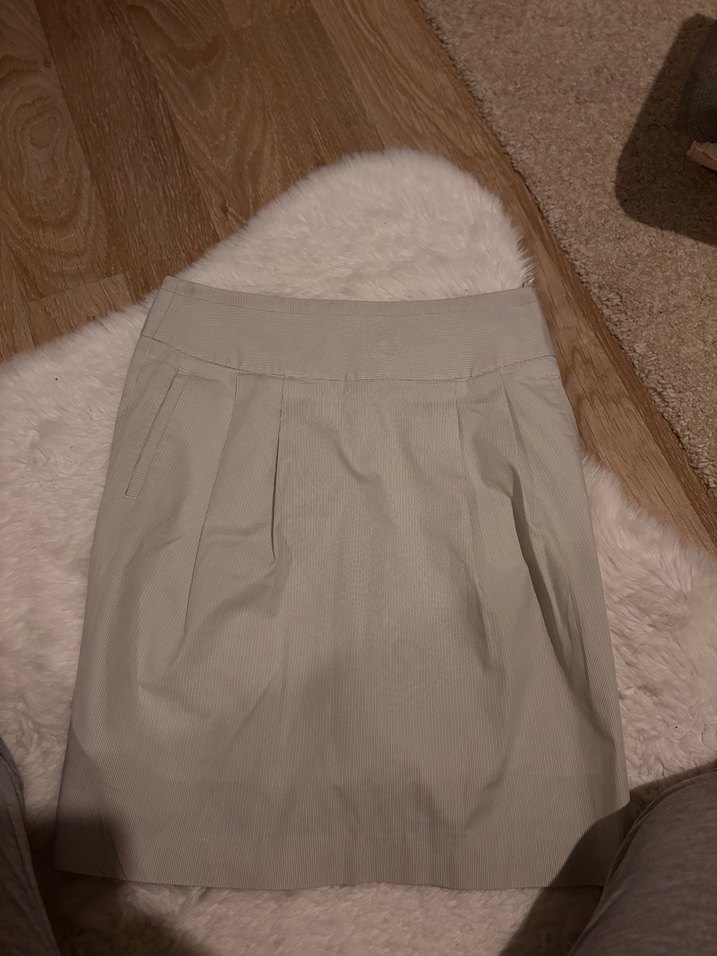Bej renkte, pilili ve bol kesim midi uzunluğunda kadın eteği. Yumuşak sentetik kumaştan üretilmiş, sade ve minimal tasarıma sahip.