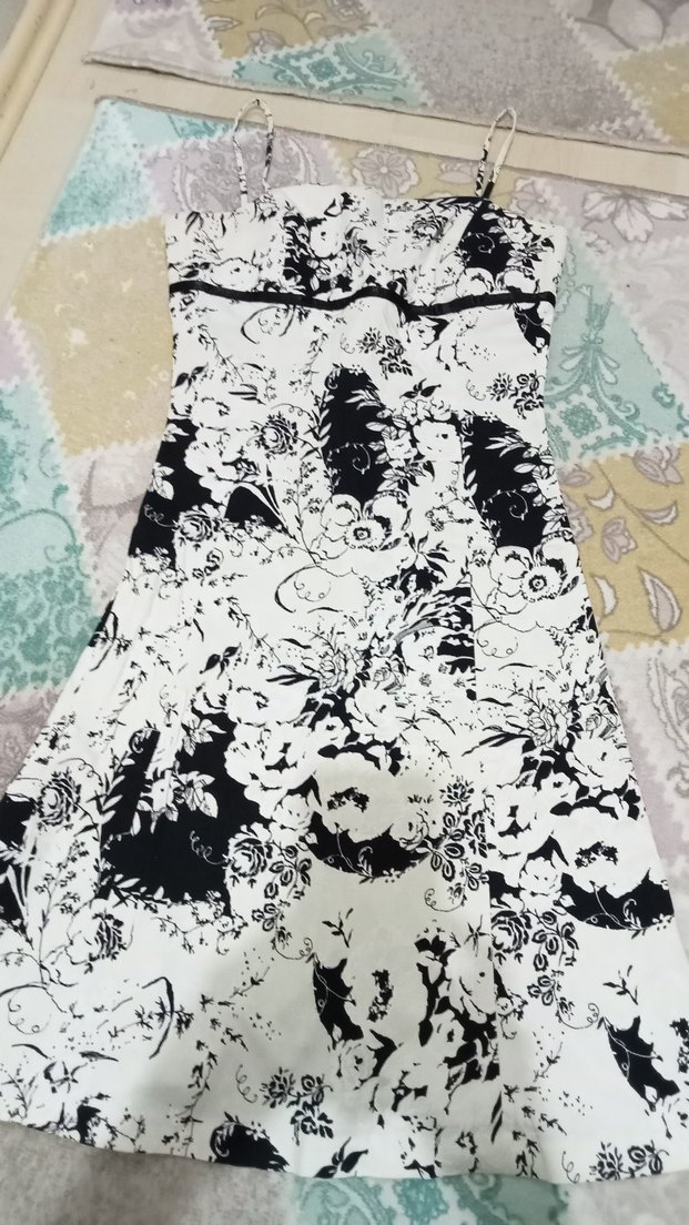pamukkumaştan, roba kurdele detaylı, siyah-beyaz desenli, straplez ve midi kesim bohem tarzda vintage elbise. Günlük kullanım için uygundur.