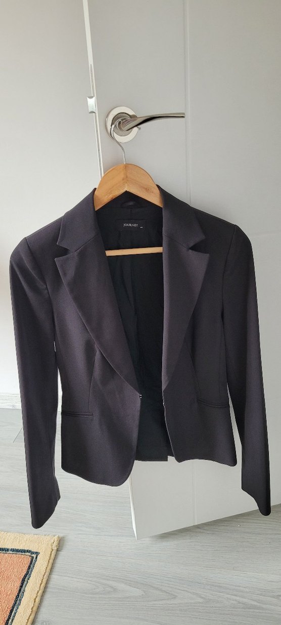 JOURNEY markalı siyah kadın blazer ceketi, düğmeli, yaka detaylı ve uzun kolludur. İpeksi kumaştan yapılmış, normal boy ve rahat kesime sahiptir.