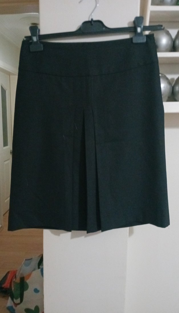 Siyah renk, pilili ve midi boy sentetik kumaştan üretilmiş, düzenli kesim ve ofis stiline uygun sade gotik tasarım.