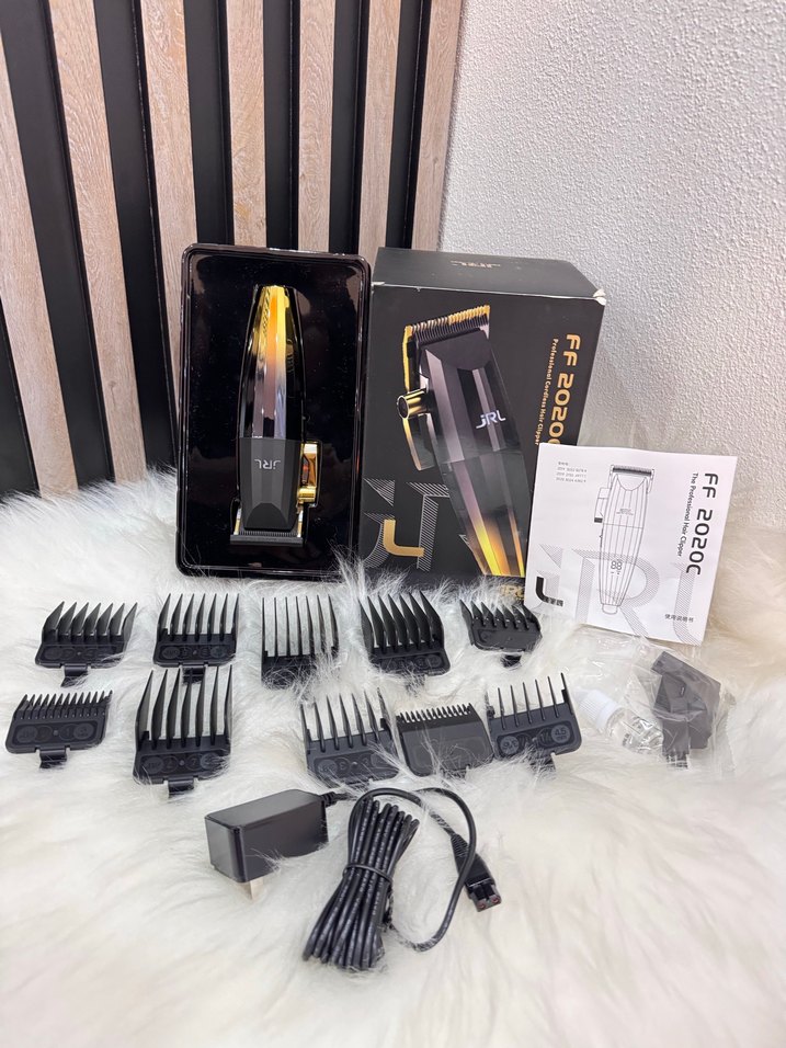 JRL FE 2030C siyah saç kesme makinesi, çeşitli tarak başlıkları, şarj kablosu ve kullanım kılavuzu ile birlikte gelir. ✂️