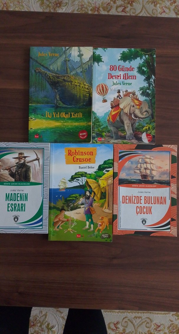 Jules Verne'in Robinson Crusoe, 80 Günde Devri Alem ve Madenin Esrarı gibi çocuk kitaplarından oluşan set.