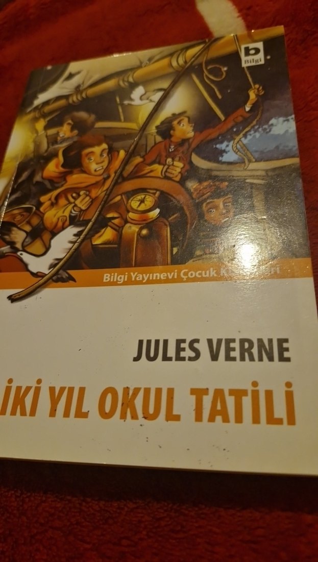 Jules Verne'in çocuklar için Bilgi Yayınevi tarafından yayımlanan 'İki Yıl Okul Tatili' kitabı, macera dolu kapak görseline sahiptir.