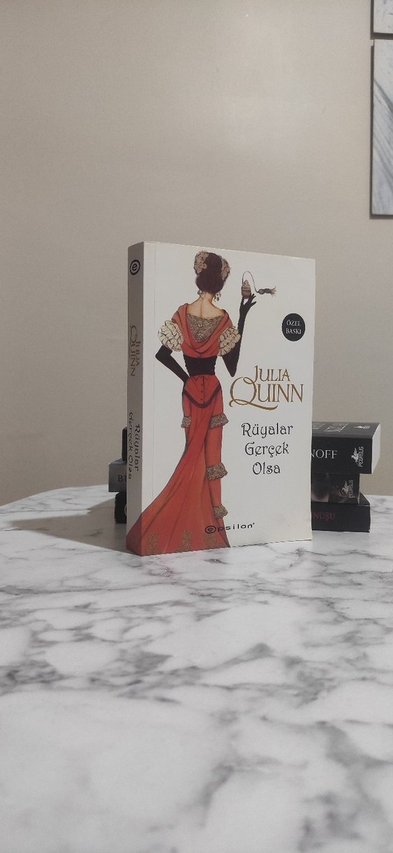 Julia Quinn'in "Rüyalar Gerçek Olsa" adlı romanı, kırmızı elbiseli bir kadının çiziminin yer aldığı kapakla birlikte.