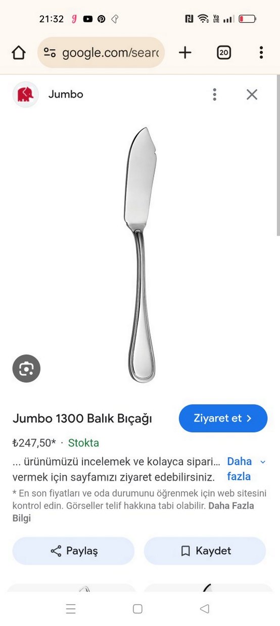 Jumbo 1300 balık bıçağı, parlak gri renkte ve şık tasarımla balık servisi için uygundur.