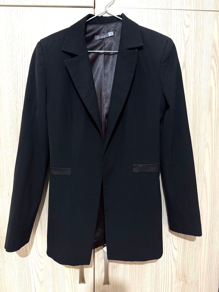 Düğmeli ön kapamalı, siyah kadın blazer ceket. Uzun kollu, normal kesim ve midi boyda, düz ve desensiz tasarıma sahiptir. Sentetik kumaştan üretilmiştir.