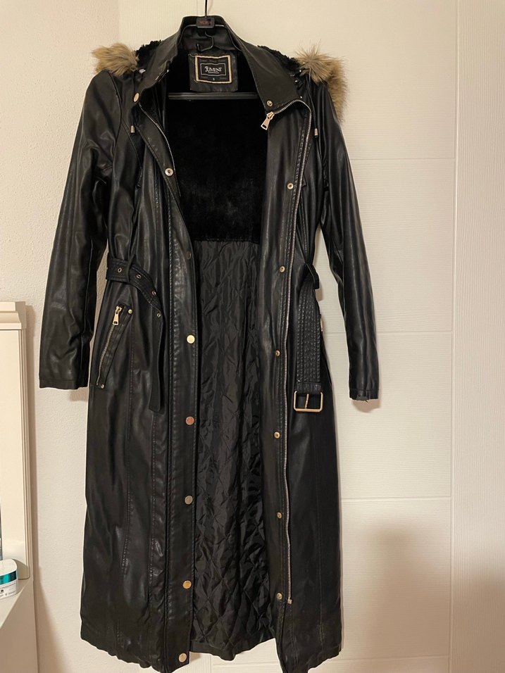 Jument marka Uzun siyah deri kadın ceket, kürklü kapüşon,Çok az sayılı giyildi dolapta beklemeye bağlı kol uç kısmında hafif deri dökülmesi oluşmuş. İç sırt kısmı ve kapşonu peluştur çok sıcak tutuyor.Kapşonu fermuarlı çıkartılabilir.fermuarlı ve çıt çıt kapalıdır
