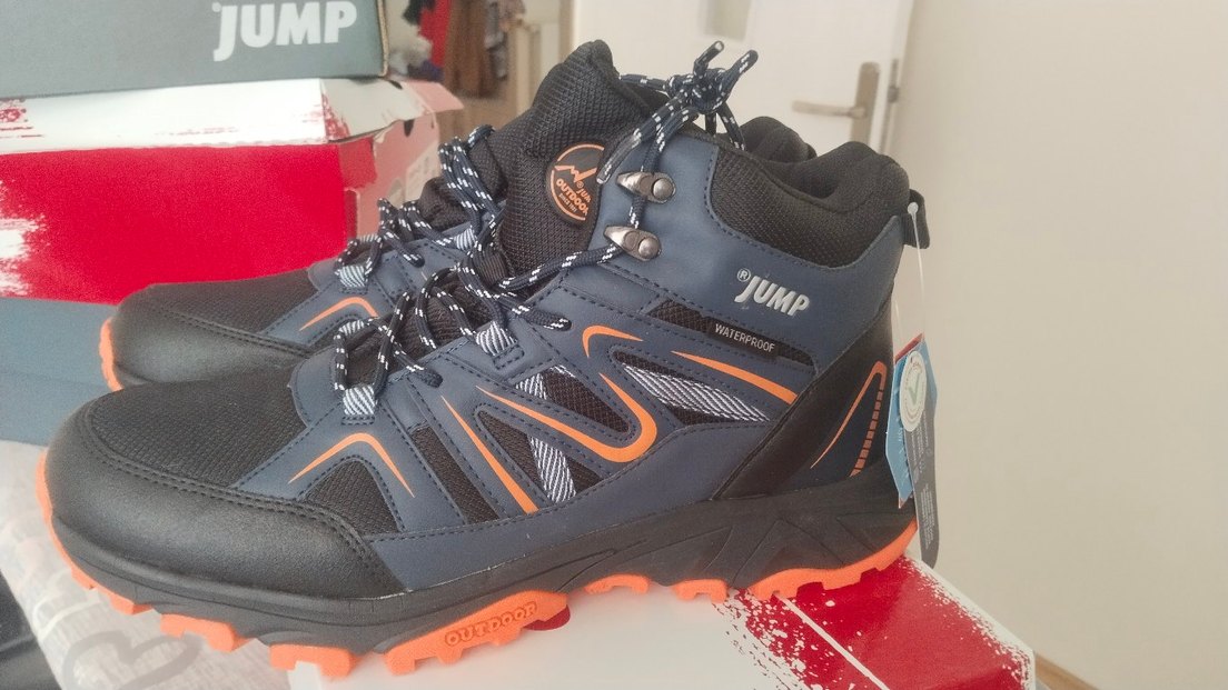 JUMP markalı erkek tur ayakkabısı, su geçirmez, kauçuk tabanlı ve turuncu renkli baskılı detaylara sahip. Kayışlı ve biker tarzı, şık ve rahat kullanım sunar.