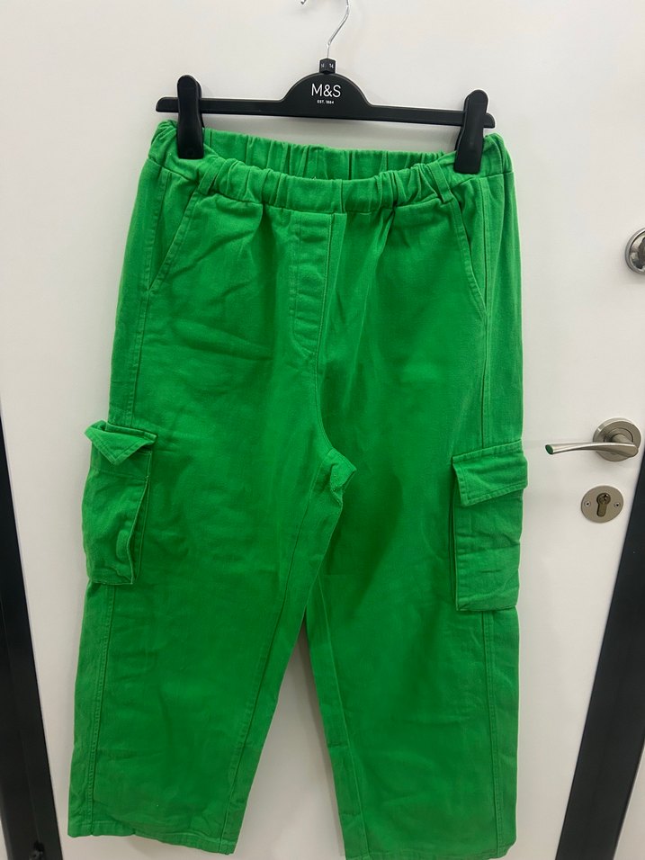 Yeşil renkli, bol kesim kargo cepli, kemerli ve midi boy pantolon. Yumuşak ve sıcak kumaştan, sokak stilinde, dış mekan kullanımı için uygun. Paçasında açık yeşil bir defosu bulunmakta