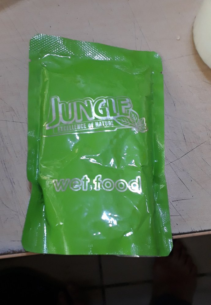 Jungle markalı yeşil ambalajda ıslak kedi maması. Kediler için nemli ve besleyici bir öğün sunar.