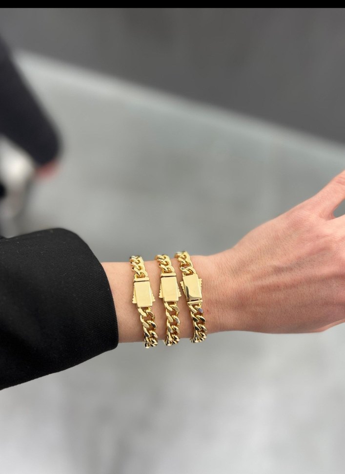 Altın renginde, zincir detaylı, parlak yüzeye sahip kadın bilekliği. Sokak modasına uygun, minimalist ve şık tasarım, günlük kullanım için ideal. ✨