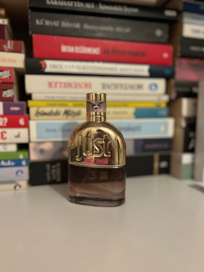 Gold kapaklı cam şişede Just Cavalli kadın parfümü, sofistike bir koku sunar.