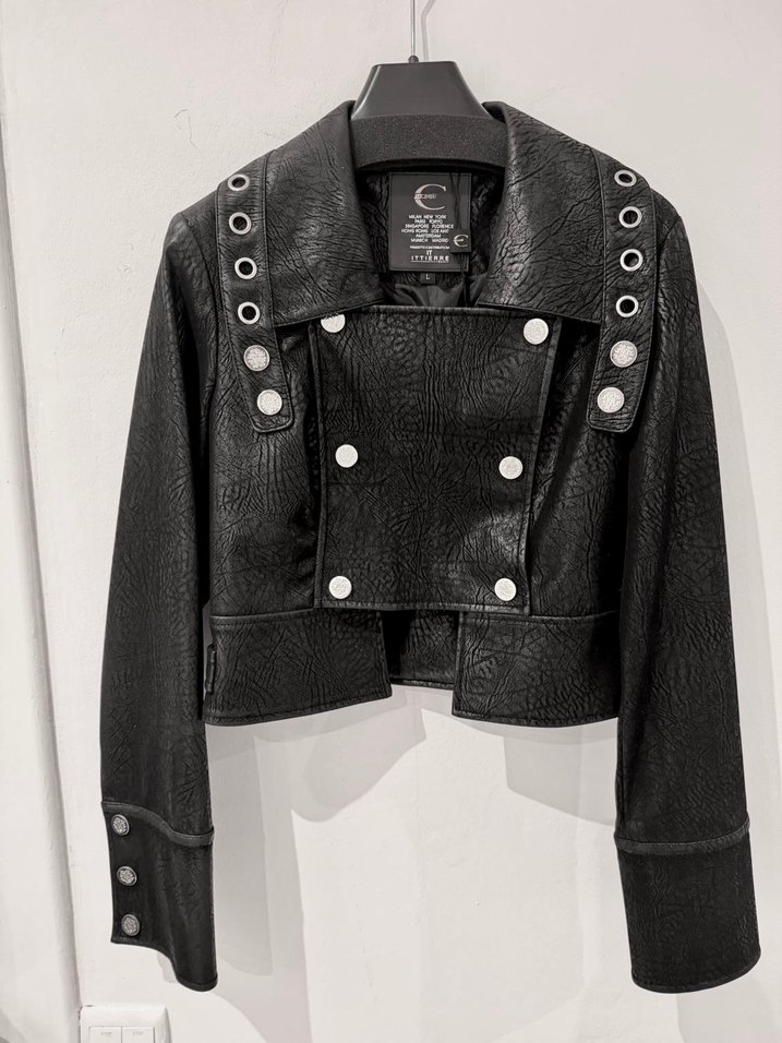 Just Cavalli Siyah Mini Deri Kadın Ceket L beden yazıyor ama M uyumlu. Düğme detaylı, yaka kısmı kesik siyah mini deri kadın ceket, grunge punk tarzında uyum sağlar.