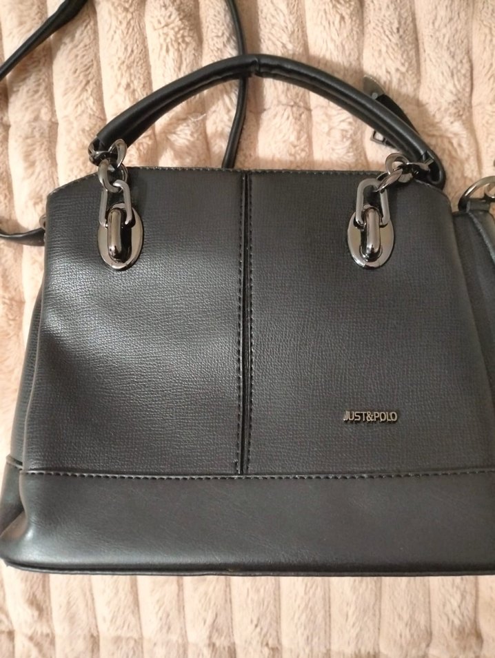 Gri renkli deri kadın çantası, tokalı saplara ve modern klasik stile sahiptir. Üzerinde "UST&POLD" logosu bulunur, klasik zarafetle günlük kullanımı birleştirir.