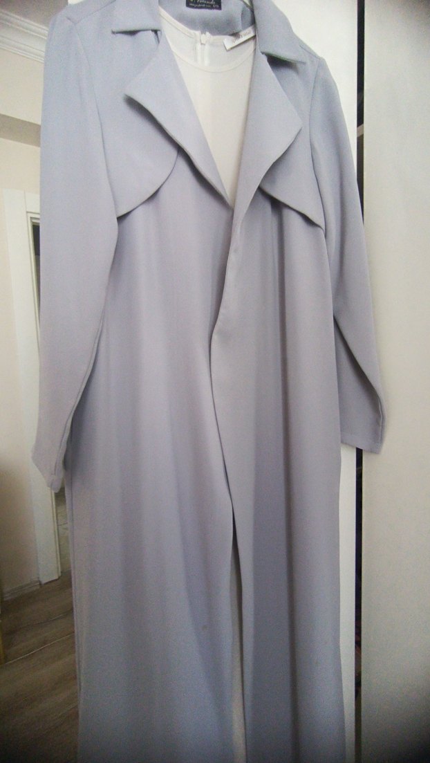 Standart beden, drapeli tasarımlı, gri renkte uzun kadın dış giysisi. Notch yaka ve uzun kollu, rahat kesim. Yumuşak sentetik kumaştan, sade ve desensizdir. kumaş kalitesi çok iyi dökümlü durmaktadır.