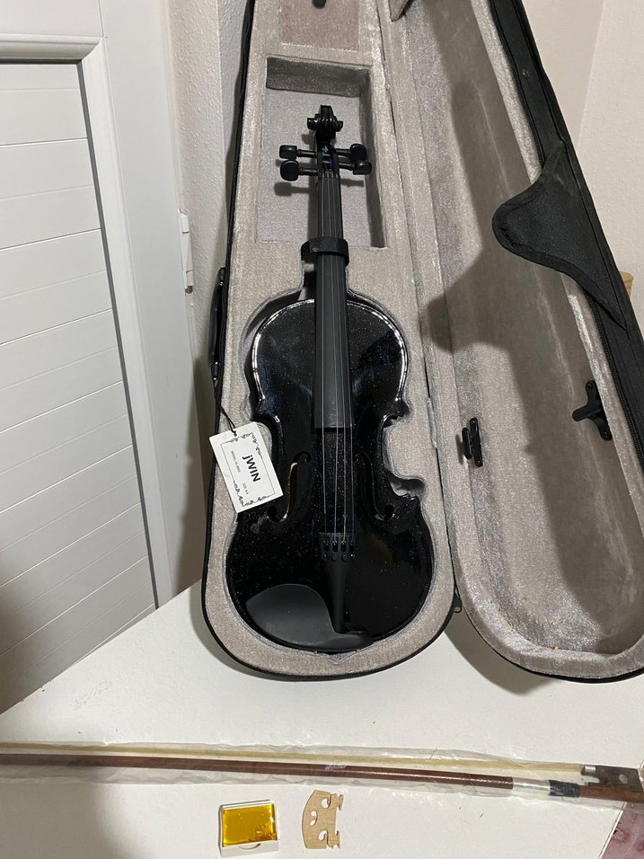 Koyu siyah renkte, düzgün yüzeyli keman ve uyumlu kılıfı. Standart akort burguları, yayı ve reçinesi ile birlikte. yeni temiz