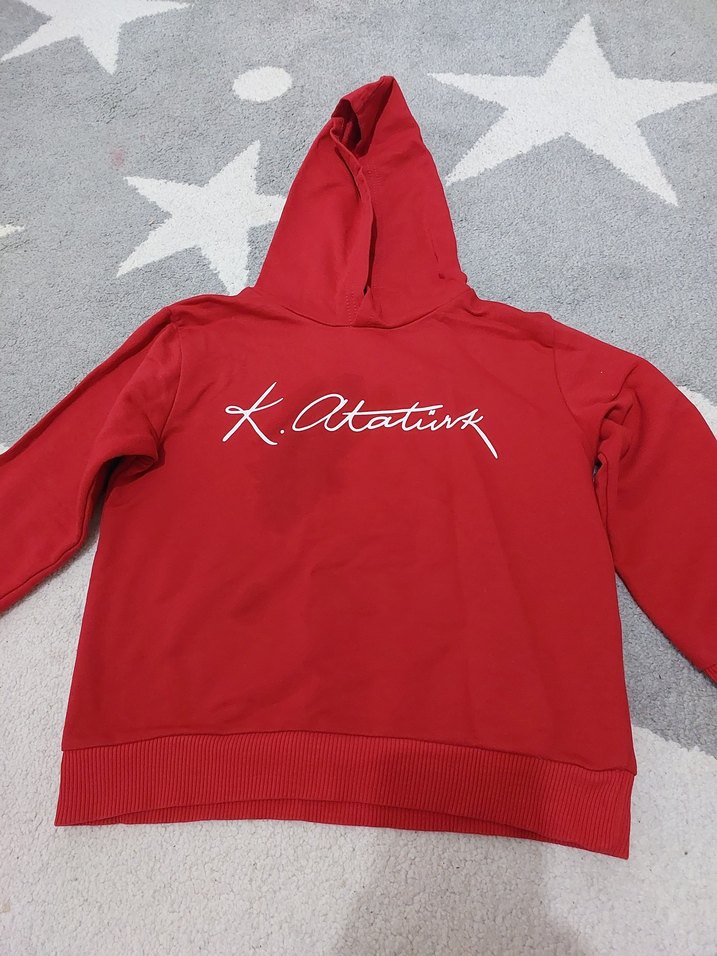 K. Atatürk baskılı, uzun kollu, kapüşonlu kırmızı sweatshirt. Bol kesim ve fermuarlı detaylı, yumuşak ve sıcak kumaştan üretilmiştir. Rahat günlük kullanım için uygundur. ürünün yazısının üstünde leke görünüyor küçük geldiği için geçiyormu diye uğraşmadım fiyata yansittim.