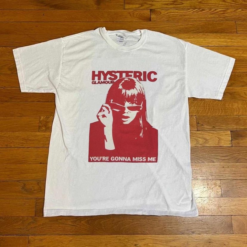 Parlak baskılı, kısa kollu, beyaz kız çocuk tişörtü. 'HYSTERIC YOU'RE GONNA MISS ME' yazılı grafik ve yuvarlak yaka içerir.