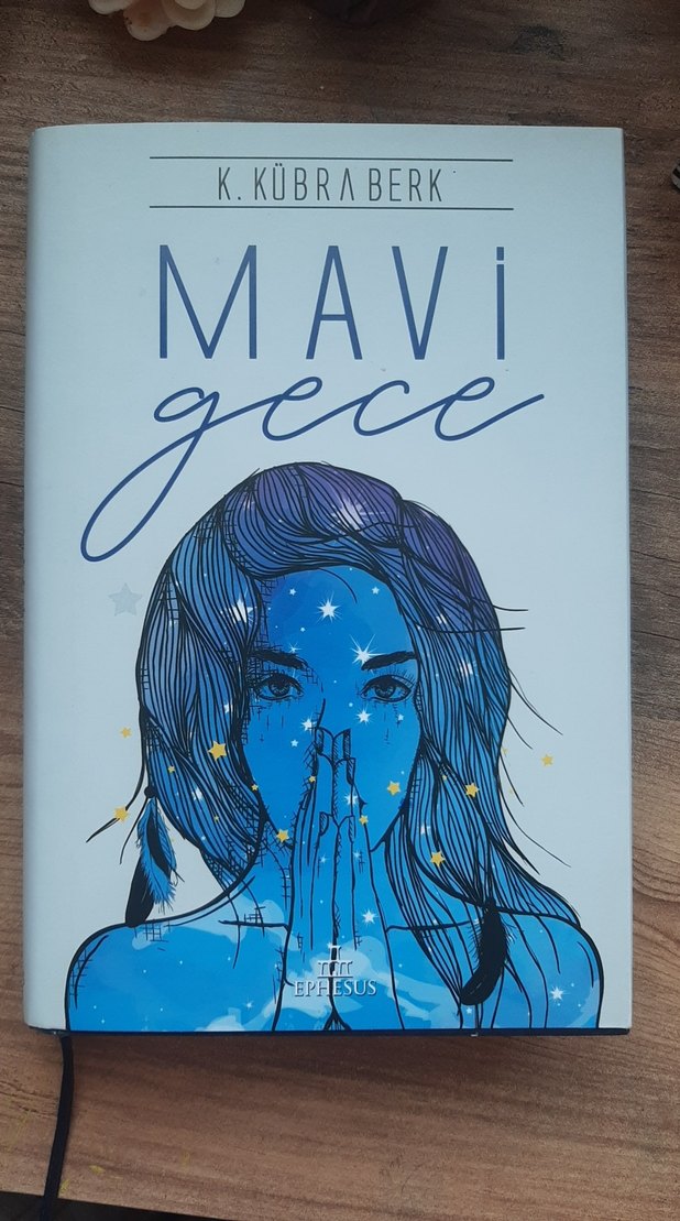 K. Kübra Berk'in "Mavi Gece" adlı romanı, yıldızlarla çevrili mavi tonlarda bir kadın illüstrasyonuna sahip.