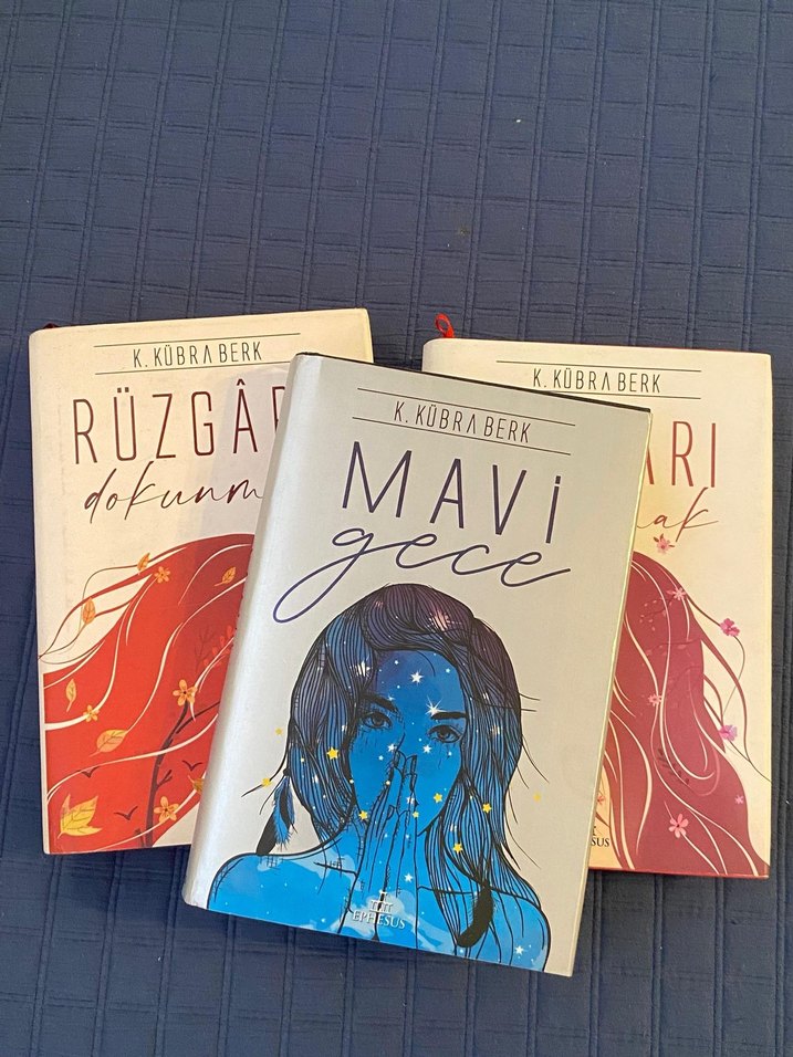 K. Kübra Berk'in 'Rüzgâr Dokunuşu' ve 'Mavi Gece' dahil 3 romanlık set. Her kitabın kendine özgü kapak tasarımı var.