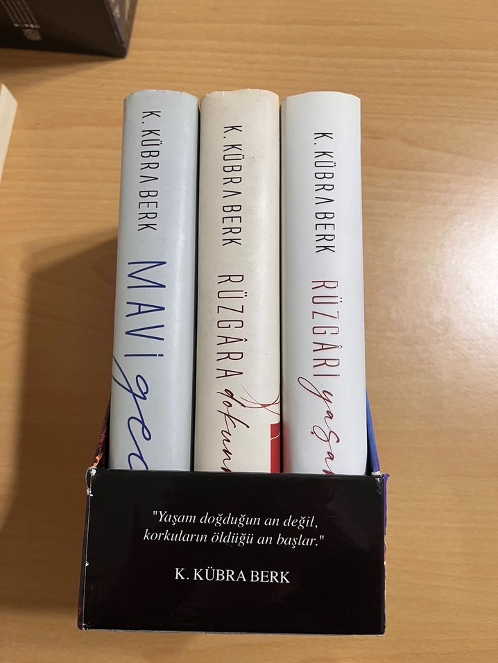 K. Kübra Berk'in "Mavi", "Rüzgara Dokunuş" ve "Rüzgarı Yaşamak" adlı üç romanından oluşan set. Kutuda "Yaşam doğduğun an değil, korkuların öldüğü an başlar." sözü yer alıyor.