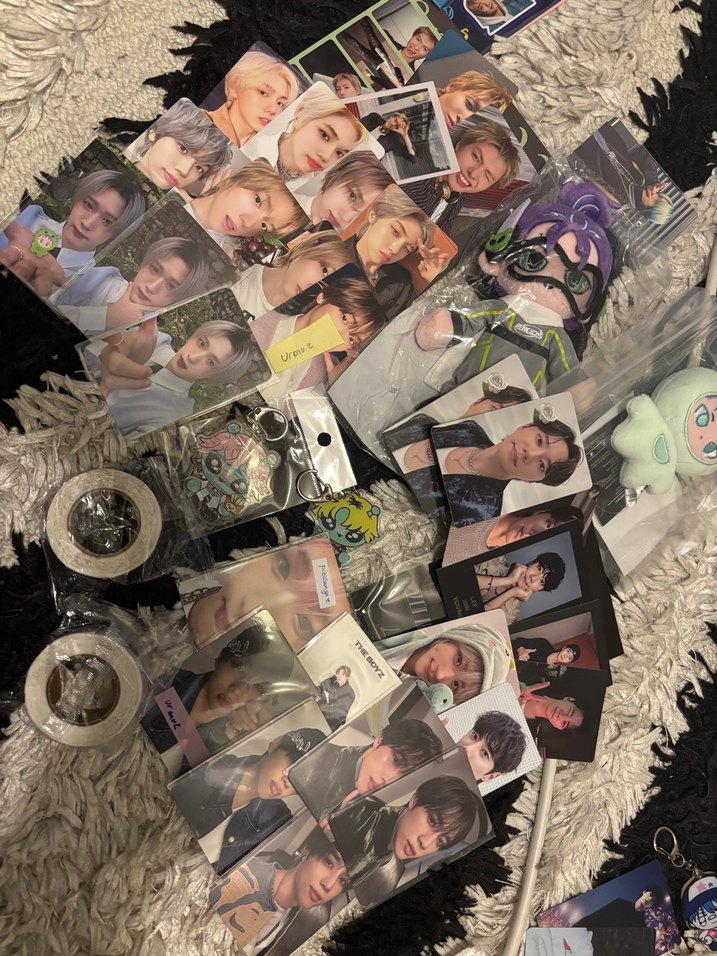 Çeşitli sanatçıların foto kartları, anahtarlıklar ve çıkartmalar içeren K-Pop koleksiyon seti.